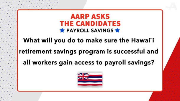 Aiona: Great program. I'm glad that we are joining the rest of the states in the United States in regards to enacting that type of program. As governor, I need to know, I need to make sure, first of all, that it's timely enacted; that we identify the businesses that are applicable to this program; that we identify the workers or the employees that, because this is a unique law in the sense that employees have to opt in as opposed to being just notified about this program. So we need to know that we make sure that we notify them, and most importantly, make sure that the employers themselves, who have no retirement plan, understand that this is a state-facilitated program, that they need to be a part of it, and more importantly, that they do not contribute a single dime to this program. These are about IRA Roths, and we want to make sure that all of our employees have that retirement when it's all said and done.